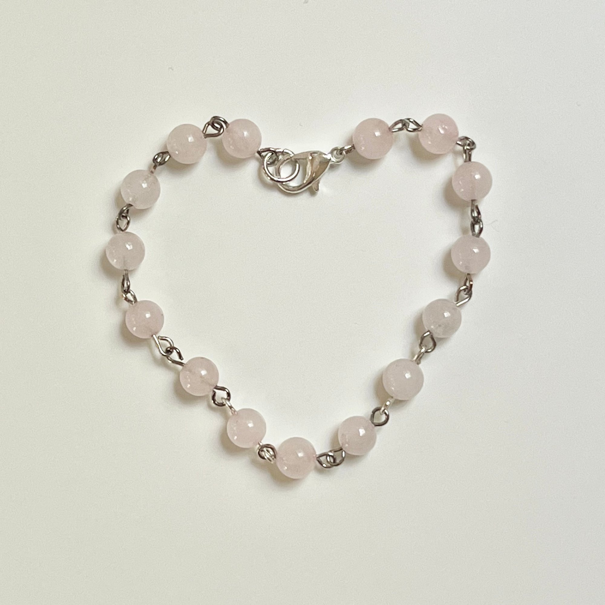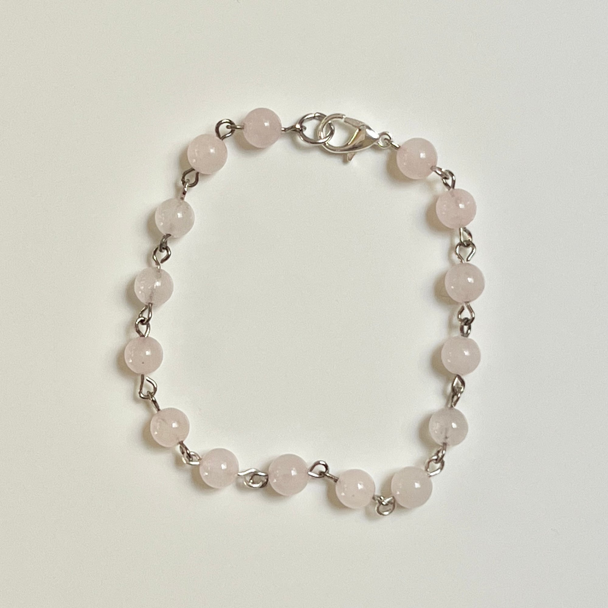 bracelet made using dyed rose quartz beads, eye pins, and a lobster clasp. measures to about 8 inches long.